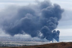 Сегодня огня не видно, но черный дым еще поднимается высоко.  Из плюсов: ветер сменил направление, и теперь дым уносит не в сторону залива, — так что горизонт почти чистый.